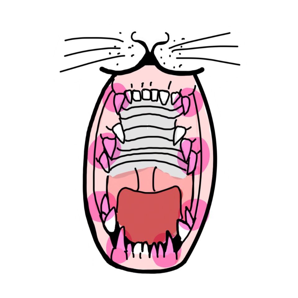 เปิดปากสัตว์เลี้ยง(บริเวณสีชมพูคือฟันเขี้ยวและฟันกรามจุดที่จะพ่นยา)