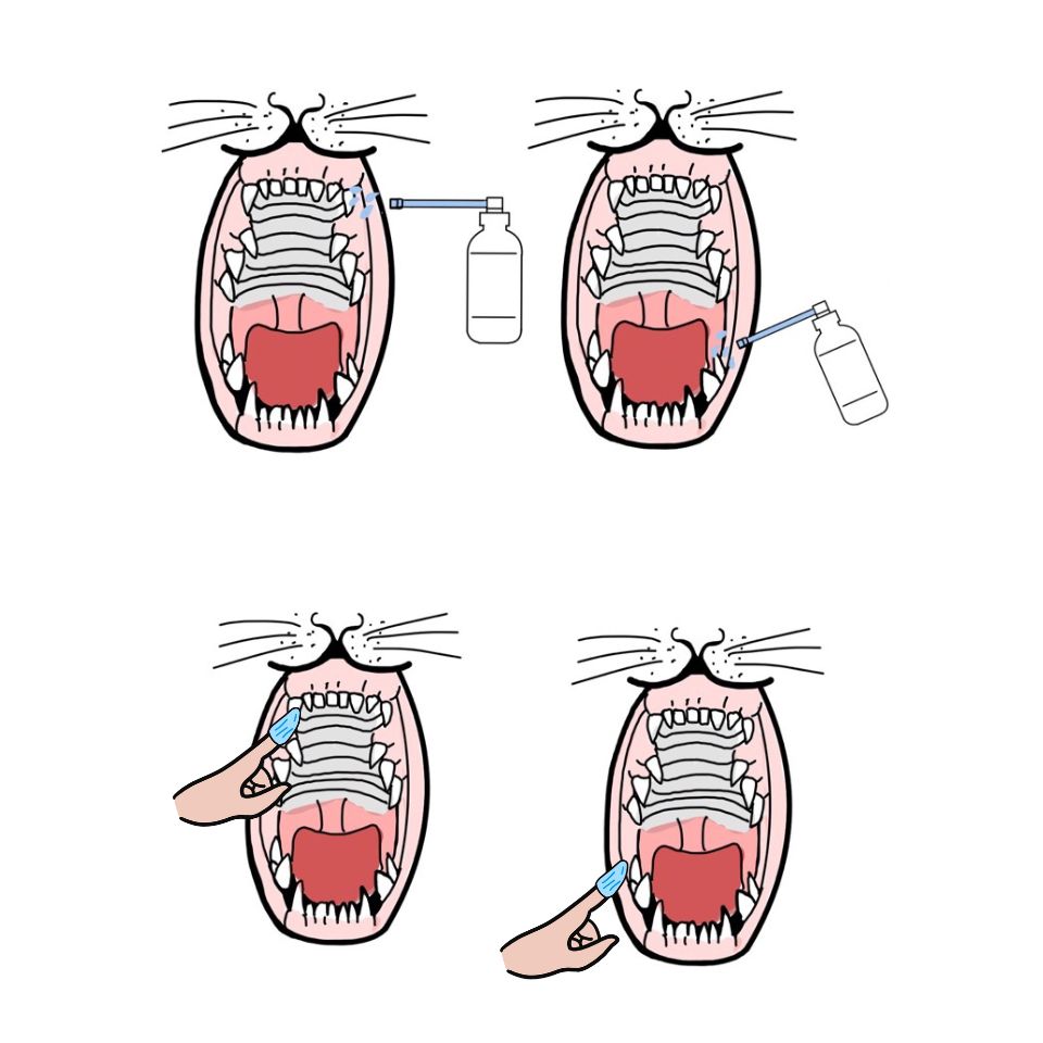 ใช้สเปรย์บริเวณฟันกราม และฟันเขี้ยว ทั้งข้างซ้ายและข้างขวา บนและล่าง จุดละ 1 ปั๊ม วันละ 1 หรือ 2 ครั้ง หรือ พ่นใส่นิ้วชี้ที่สวมถุงสวมนิ้วอนามัยและทำการถูบริเวณฟันให้ทั่ววันละ 1-2 ครั้ง โดยไม่ต้องล้างน้ำออก