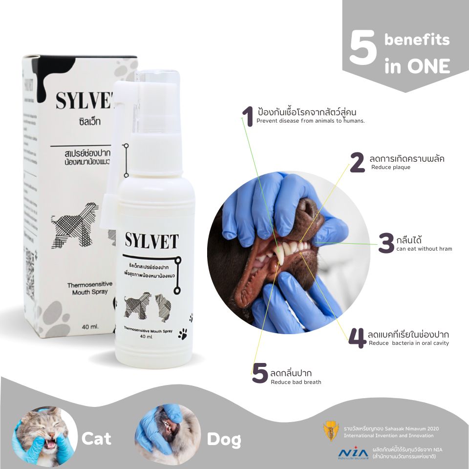 ‘Sylvet Thermosensitive Mouthwash Spray’ คือสเปรย์ที่ช่วยดูแลรักษาสุขภาพของช่องปากน้องหมาและน้องแมว นวัตกรรมและเทคโนโลยีที่ช่วยให้สารสำคัญออกฤทธิ์ได้ยาวนาน สามารถเปลี่ยนจากสารละลายใสเป็น เจล ภายในช่องปากเมื่อทำปฏิกิริยากับแคลเซียม ณ อุณหภูมิในช่องปากสัตว์เลี้ยง ทำให้สารสำคัญภายในสเปรย์สามารถออกฤทธิ์กำจัดกลิ่นปากและฆ่าเชื้อก่อโรคได้มีประสิทธิภาพสูงที่สุดและออกฤทธิ์ได้อย่างยาวนาน สามารถใช้ได้วันละครั้ง